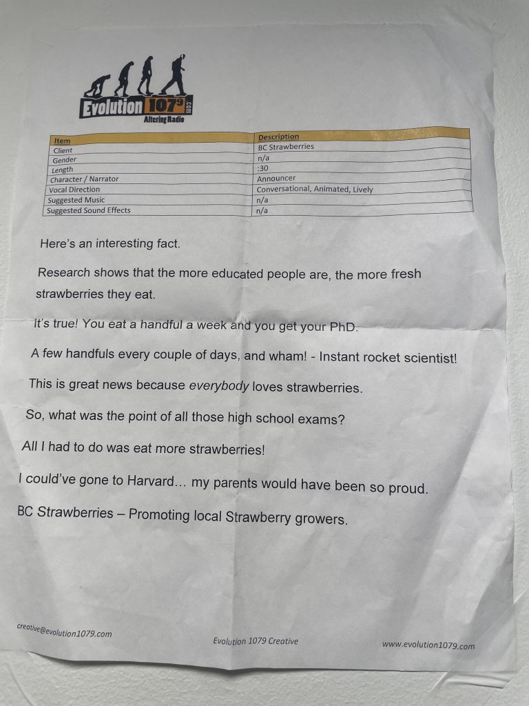 BC Strawberries was the very first Voiceover Commercial that Dawson produced in term 1 at BCIT in the Sound Design Class. The professor, Dan Motut, provided the class a great example as he brought the students into the studios in the BCIT Broadcast Center at SE 10 and did it himself before the rest of the first year students sat in front of the microphone to experience it themselves.
