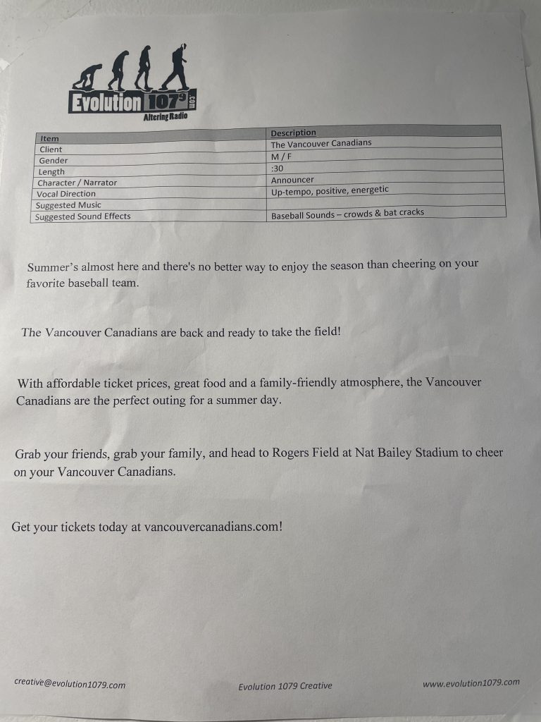 Dawson got his first taste of a sports based voiceover commercial in mid October and that being for the Vancouver Canadians Professional High A Affiliate Baseball team of the Toronto Blue Jays.